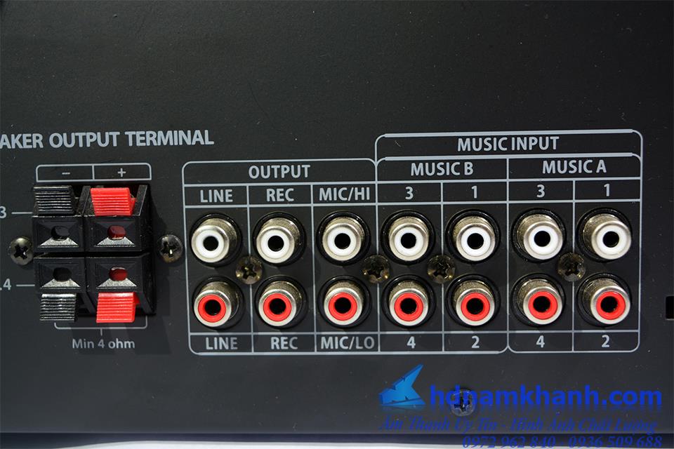 - Ngõ vào kết nối : 2 ngõ vào cho micro, 2 ngõ vào âm thanh stereo A/B sử dụng đồng thời được 4 loa