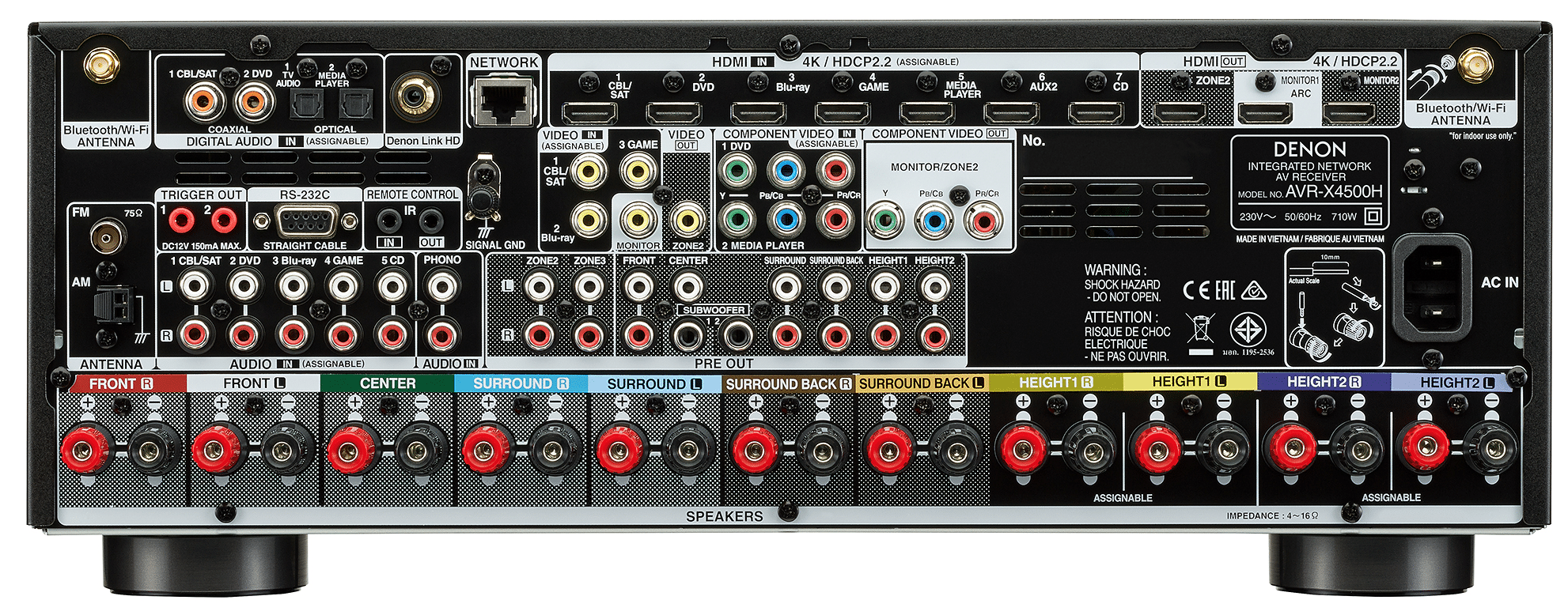 Amply Denon X4500H ứng dụng những kỹ thuật mới nhất về HDMI cho bạn sự trải nghiệm rạp hát gia đình tốt nhất. Ampli có 8 ngõ vào HDMI và 3 ngõ ra HDMI - hỗ trợ HDCP 2.2 cho phép bạn thưởng thức nội dung được bảo vệ bản quyền không bị ngăn cấm. Xem phim và chương trình với video 4K Ultra HD 60Hz, 4:4:4 Pure Color sub-sampling, Dolby Vision, High Dynamic Range (HDR10), Hybrid Log-Gamma (HLG) và video 21: 9, 3D và BT. 2020 hỗ trợ màu sắc đặc biệt, rõ ràng và tương phản một cách vượt trội.