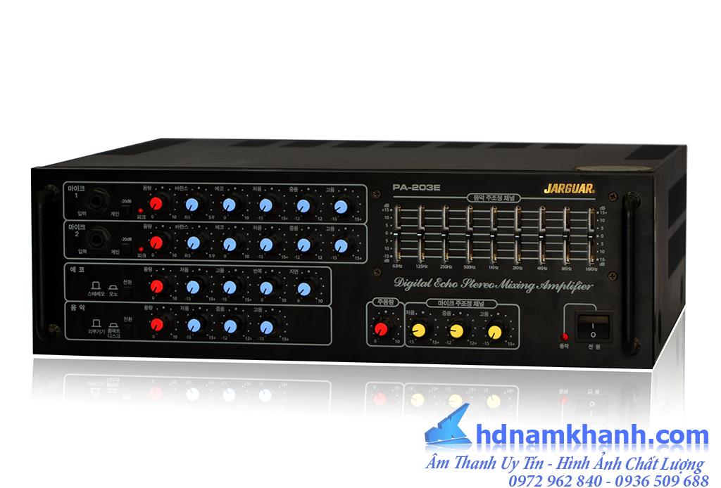 So với model Amply Jarguar PA-203N, Amply Jarguar 203E nhập khẩu Hàn Quốc 100% có bổ sung bộ cân bằng âm thanh Equalizer (EQ). Bộ cân bằng âm thanh Equalizer chuyên nghiệp sẽ cá nhân hóa gu âm nhạc của mỗi người, như thích bass nhiều hay ít, thêm âm cao, hoặc tăng âm trung để nghe rõ giọng. Dải tần âm thanh rộng hơn, cân chỉnh âm thanh chi sẽ tiết hơn, đúng theo ý muốn của các Sound man.