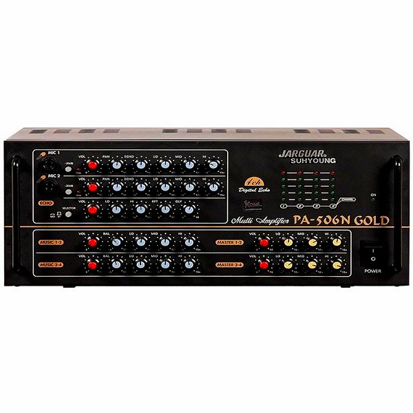 Amply Jarguar 506N Gold Komi (tên viết tắt của dòng sản phẩm amply karaoke Jarguar Suhyoung PA-506N Gold do công ty Komi nhập khẩu chính hãng Hàn Quốc) là một trong những amply karaoke có công suất đầu ra lớn nhất hiện nay. Đây là dòng sản phẩm kế thừa và nâng cấp từ chiếc amply 4 kênh có sức bán tốt nhất thị trường đó là amply Jarguar 506N. Với những gì mà Jarguar 506N đã thể hiện và đáp ứng được mong mỏi của người sử dụng thì các bạn có thể hoàn toàn yên tâm với những gì mà amply Jarguar 506N Gold Komi sẽ mang lại.