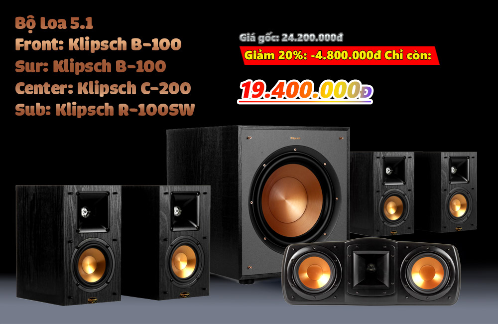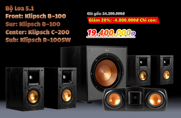 Bộ 5.1 Gồm Loa Front và Surround là Klipsch B-100, loa Center Klipsch C-200 và Loa sub Klipsch R-100SW