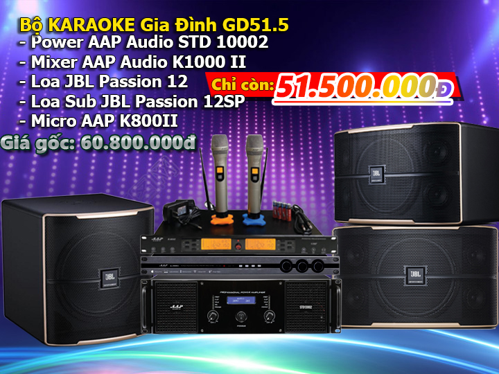 Bộ Karaoke Gia Đình Cao Cấp GD51.5 Đẩy AAP 10002, Mixer K1000ii, Loa JBL Pasion12