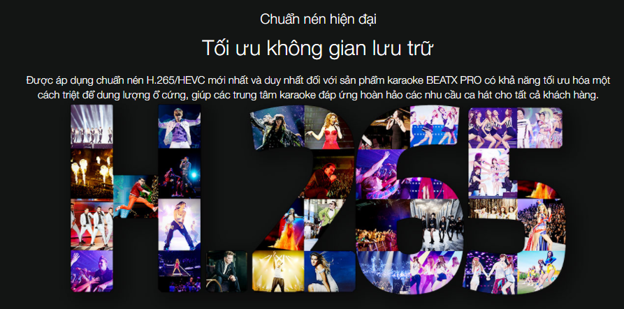 Được áp dụng chuẩn nén H.265/HEVC mới nhất và duy nhất đối với sản phẩm karaoke BEATX PRO có khả năng tối ưu hóa một cách triệt để dung lượng ổ cứng, giúp các trung tâm karaoke đáp ứng hoàn hảo các nhu cầu ca hát cho tất cả khách hàng.
