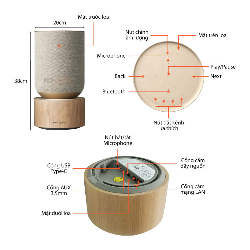 Cụ thể Loa B&O Beosound Balance có kích thước (Rộng x Cao x Sâu) 20 x 38 x 20 cm được chia thành 2 phần bao gồm:
